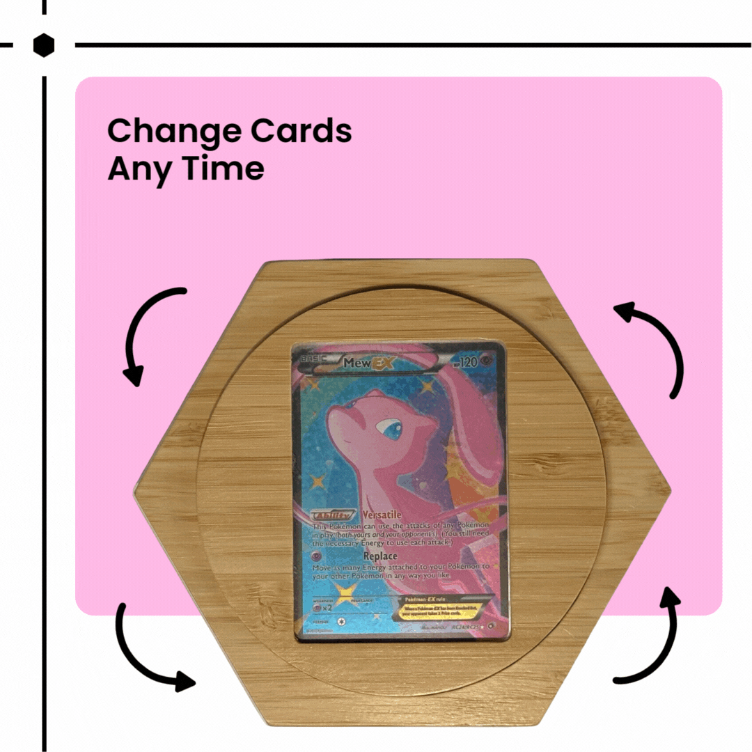 Display was designed when we realised the first thing we did after getting an amazing pull from a booster pack - was hide it in a binder and shut it away on the shelf for fear of damaging it.